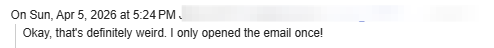 To add to the weirdness, I got two replies to an email I sent yesterday with vastly different metrics. In one, even though the person clearly opened the email because they replied to it, the system showed they didn’t.